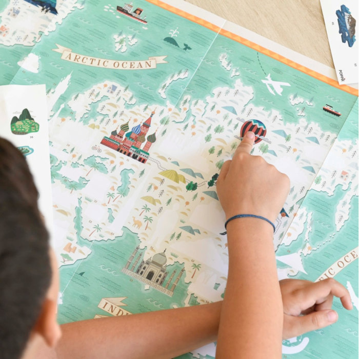 Podaj se na raziskovanje najbolj znanih svetovnih spomenikov in naravnih čudes! Poppik raziskovalni poster z nalepkami je čudovita izobraževalna igrača, ki otroke od 7. leta starosti naprej na zabaven način popelje po državah sveta in njihovih znamenitostih. Na velikem posterju (100 x 68 cm) s pomočjo 71 nalepk in enostavnih navodil se bodo otroci naučili o Big Ben-u, Kitajskem zidu, Machu Picchu in mnogih drugih znamenitostih, ki krasijo naš planet, pri tem pa razvijali fino motoriko, zbranost in občutek za estetiko. Ko je poster dokončan, ga lahko ponosno obesite na steno – rezultat je vedno osupljiv!